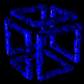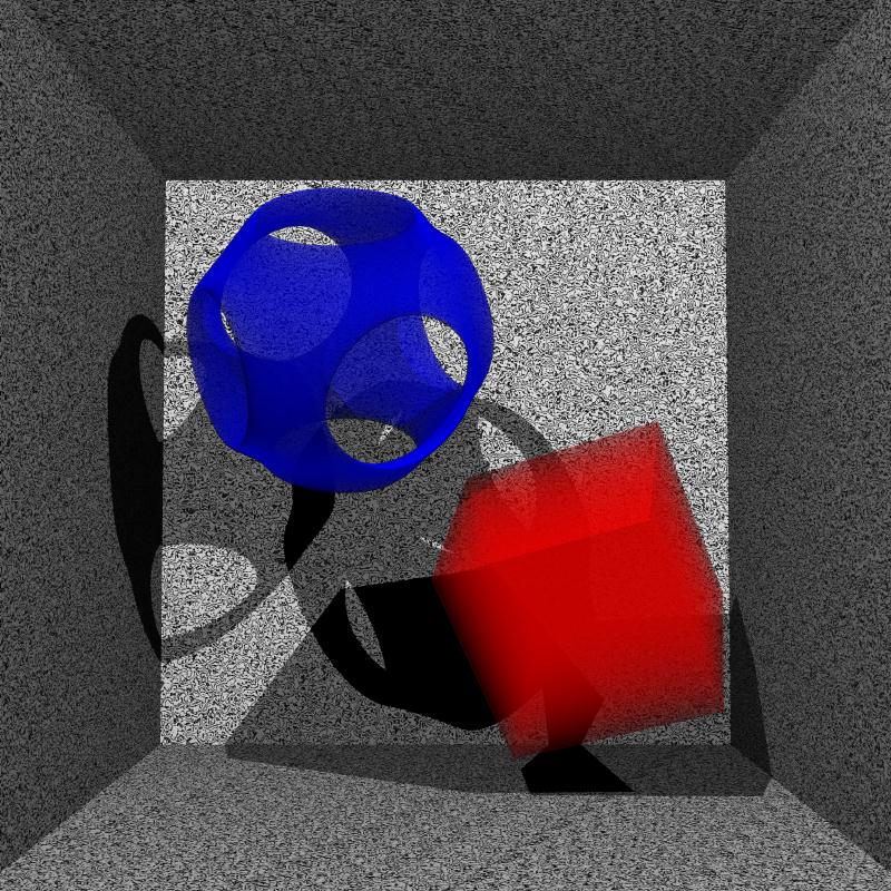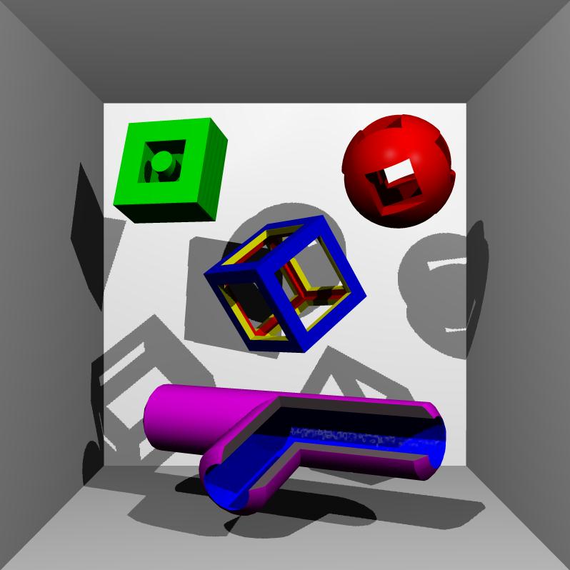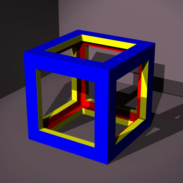 CSG Cube This object was created by starting with a blue cube. Six yellow boxes were subtracted from the sides, and then a red cube was then subtracted from the middle.