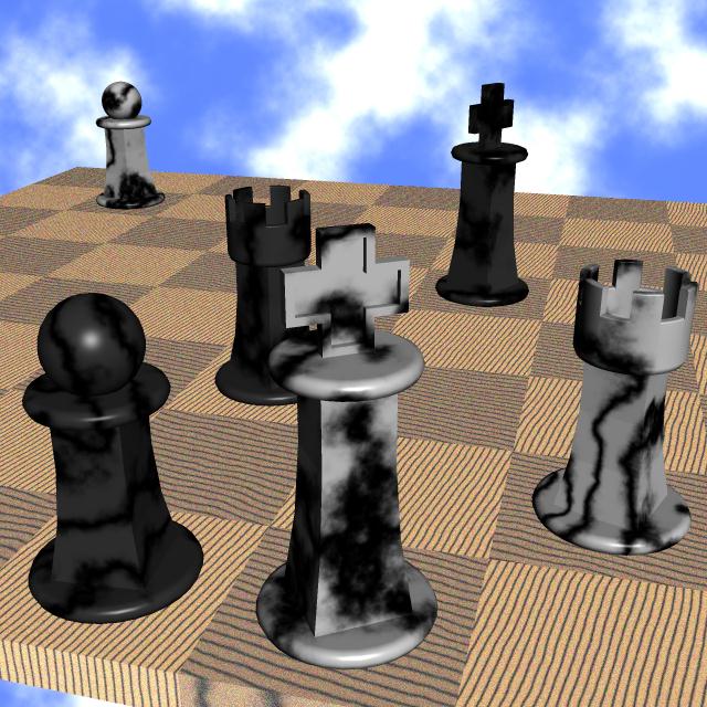Chess Board This scene demonstrates four procedural textures: white marble, black marble, wood grain, and sky with clouds.