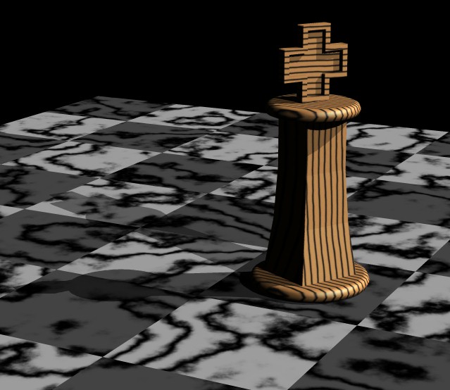 King These scene demonstrates z-buffer shadows. In addition to the shadows the king casts onto the chess board, notice the more subtle shadows the king casts onto itself.