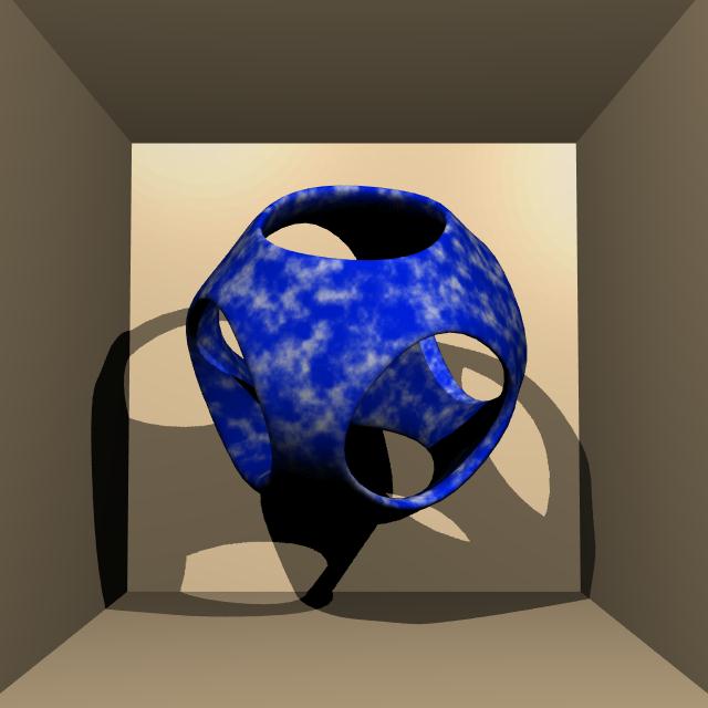 These pictures were created for ECS 275. They demonstrate my two class projects -- procedural textures and z-buffer shadows.